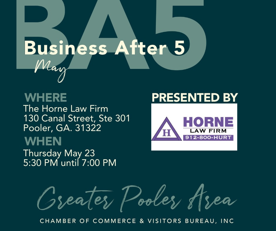 Say goodbye to stuffy suits and awkward small talk. Join us for BA5 - Business After 5 with The Horne Law Firm, where you can mingle with other Chamber members in a relaxed environment while enjoying great music and tasty snacks.