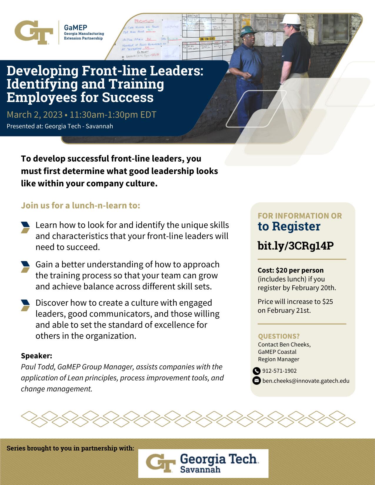 Speaker Information: Paul Todd, GaMEP Group Manager, Operational Excellence Paul Todd assists companies with the application of lean principles, process improvement tools, and change management through workshops, kaizen events, and shop-floor coaching. His expertise includes lean manufacturing, plant management, leadership development, culture change, and problem-solving. He holds a B.S. in Industrial Management from Georgia Tech. He is also a certified Training Within Industry Instructor and a Member of the Board of Examiners for the Shingo Prize for Operational Excellence.