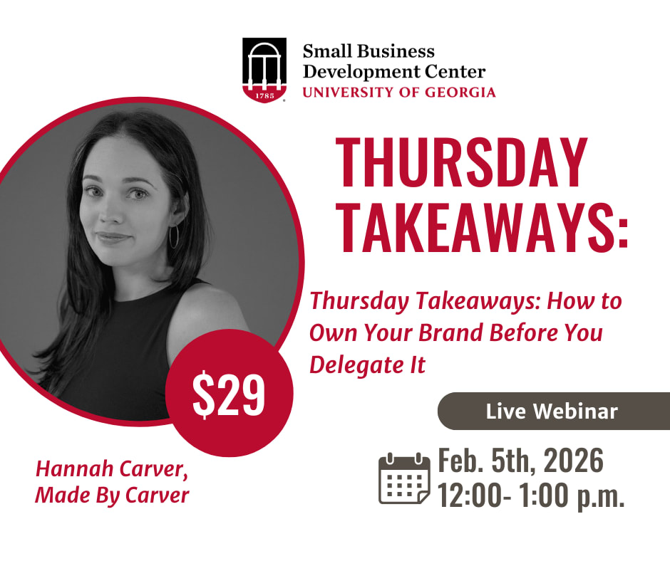 Hosted by the UGA SBDC featuring Guest Facilitator: Hannah Carver of "Made By Carver" This one-hour live webinar is for business owners ready to build a scalable brand foundation and learn how to successfully outsource their marketing. Join Hannah Carver, UGA alum, for a one-hour webinar on how to establish a solid marketing foundation before you delegate. With a career spanning from global leaders like Siemens and Delta to local favorites like Mellow Mushroom, Hannah has spent the last decade helping founders bridge the gap between their vision and their marketing results. You’ll learn the critical pieces needed to develop a growth strategy so that whether you are doing the work yourself or outsourcing, you have exactly what's needed to succeed. Stop guessing and start building a foundation that ensures every marketing dollar actually delivers. Register now at : https://ugasbdc.training/sav/0785-001
