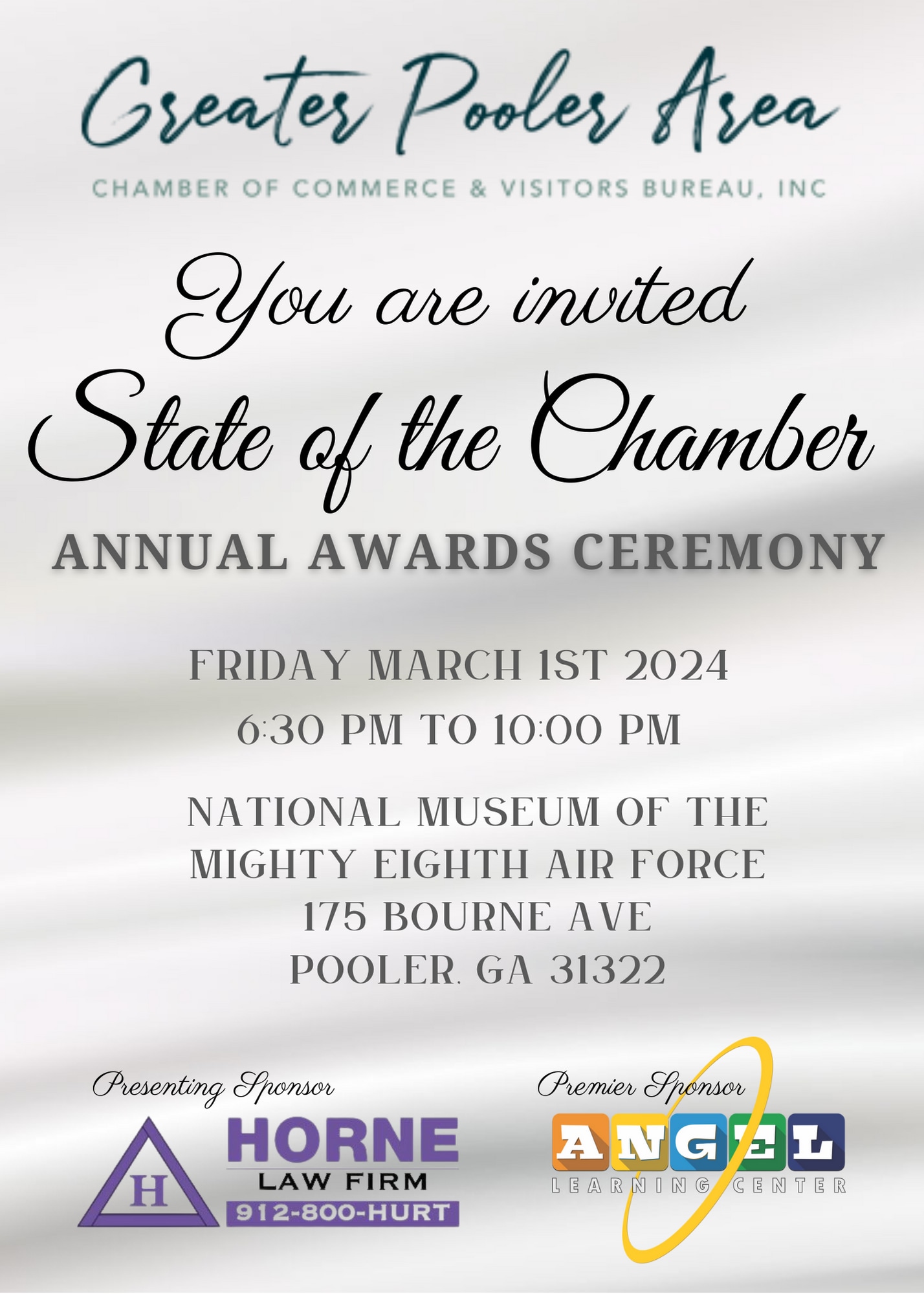 Join us at the State of the Chamber & Community Awards Ceremony as we celebrate our achievements and look ahead towards an even brighter future for our business community. It is sure to be an inspiring and memorable evening that you won't want to miss!