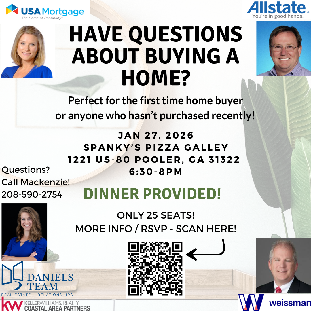 We are partnering with The Daniels Team - Keller Williams Realty in Pooler, GA in this FREE informative Home Buyers event with other local experts. Gain knowledge and insider tips to get you ready to move forward on your future new home! This is perfect for the First Time Buyers or anyone that hasn't purchased recently.